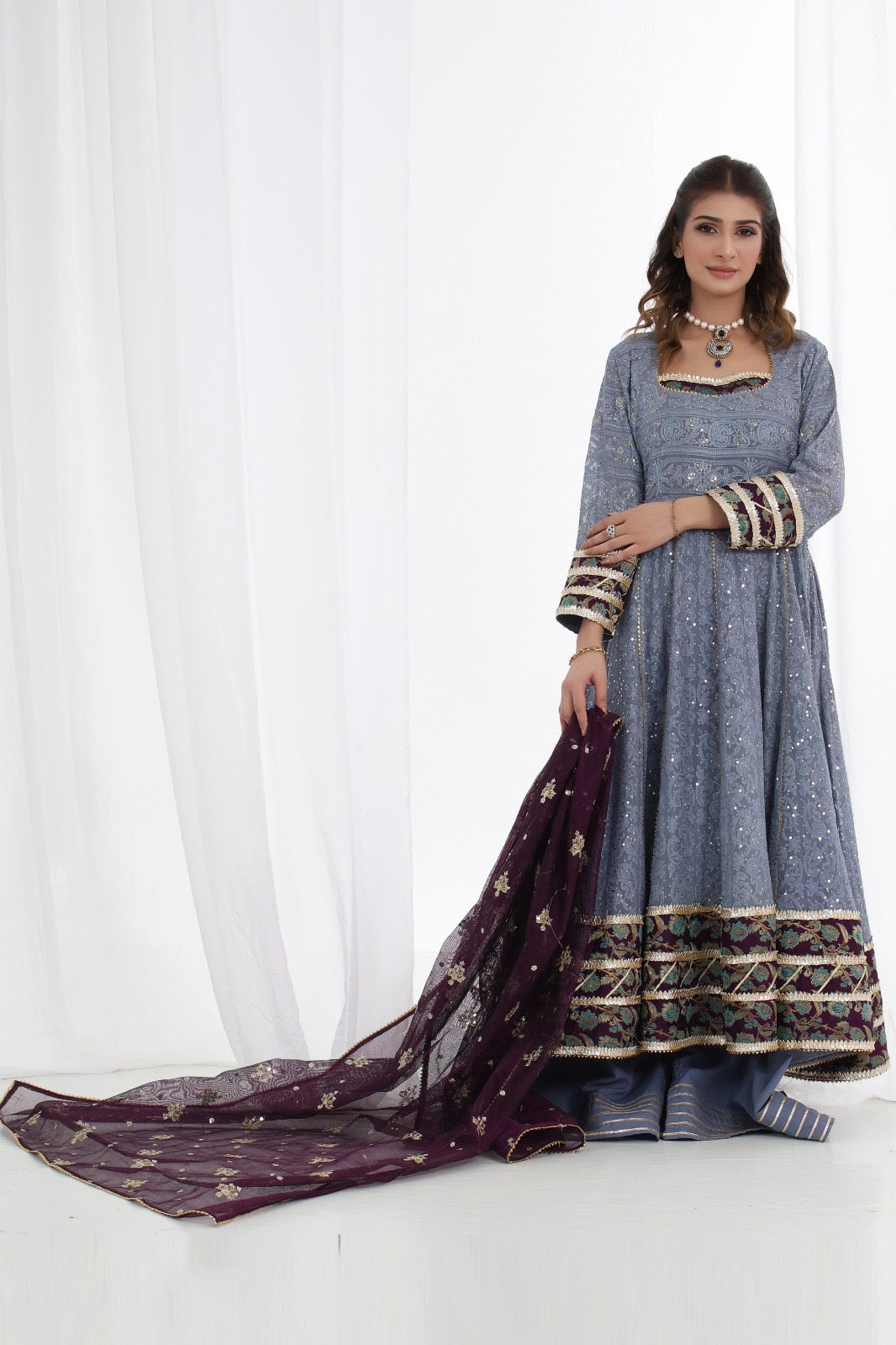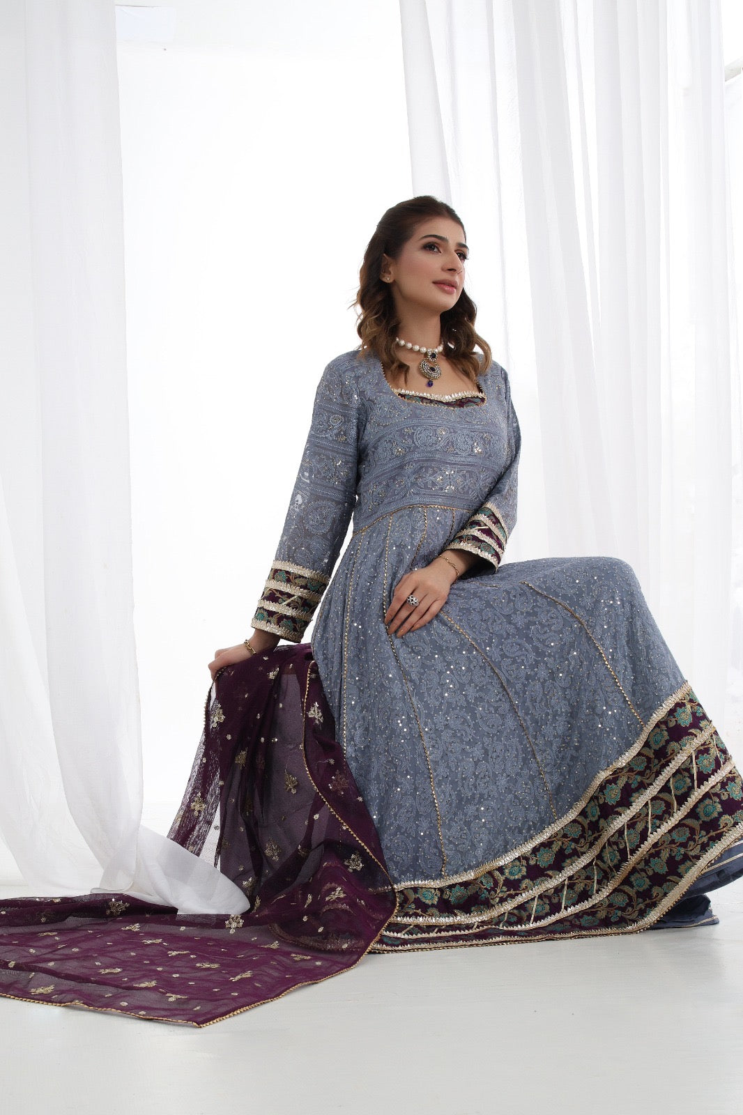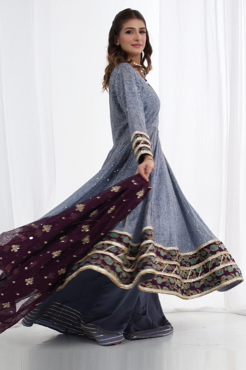 Lilac Chikankari peshwas with delicate embroidery, paired with a matching lilac sharara and a stunning jamawar dramatic border, accompanied by a chiffon embroidered duppata.