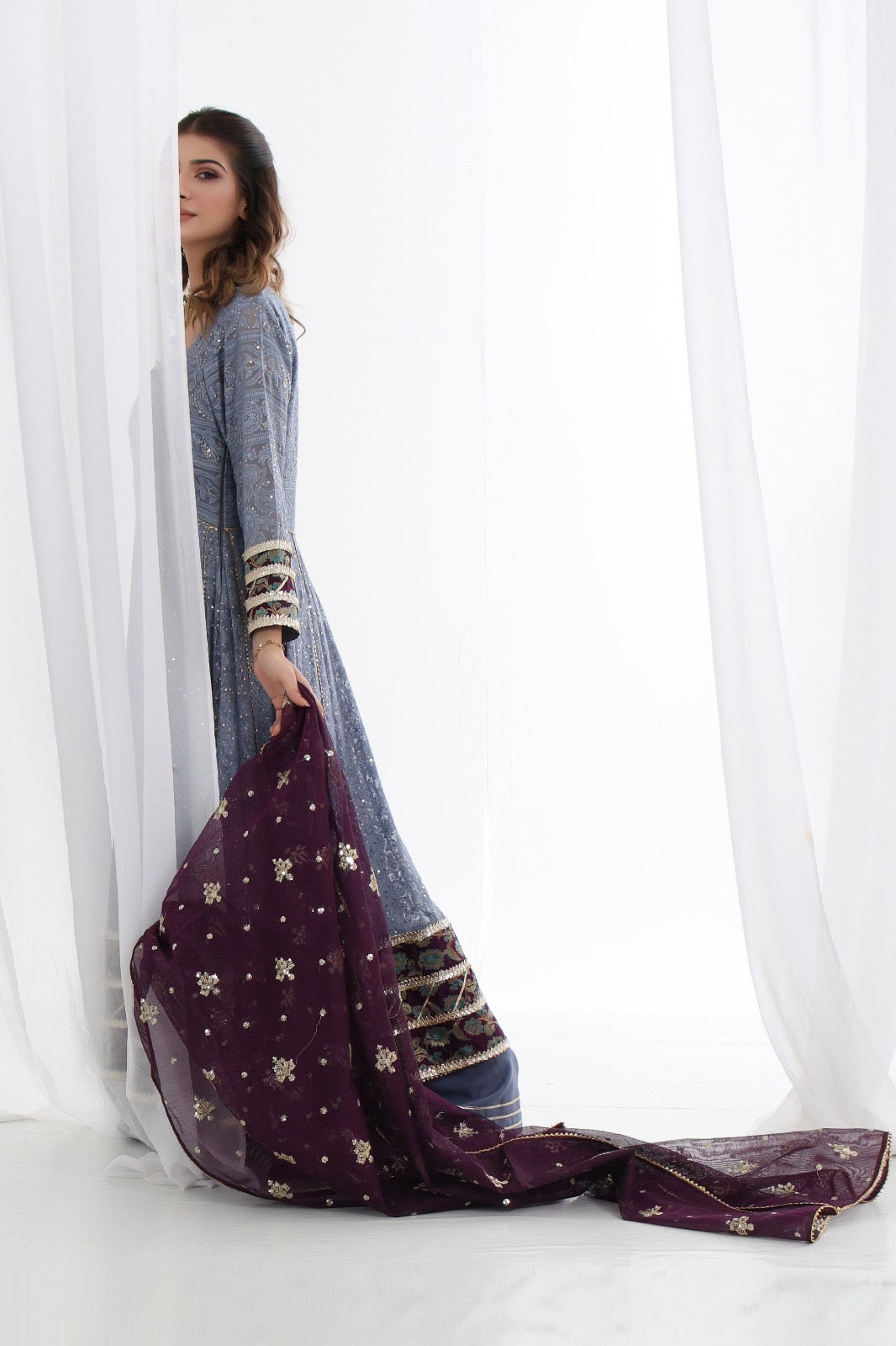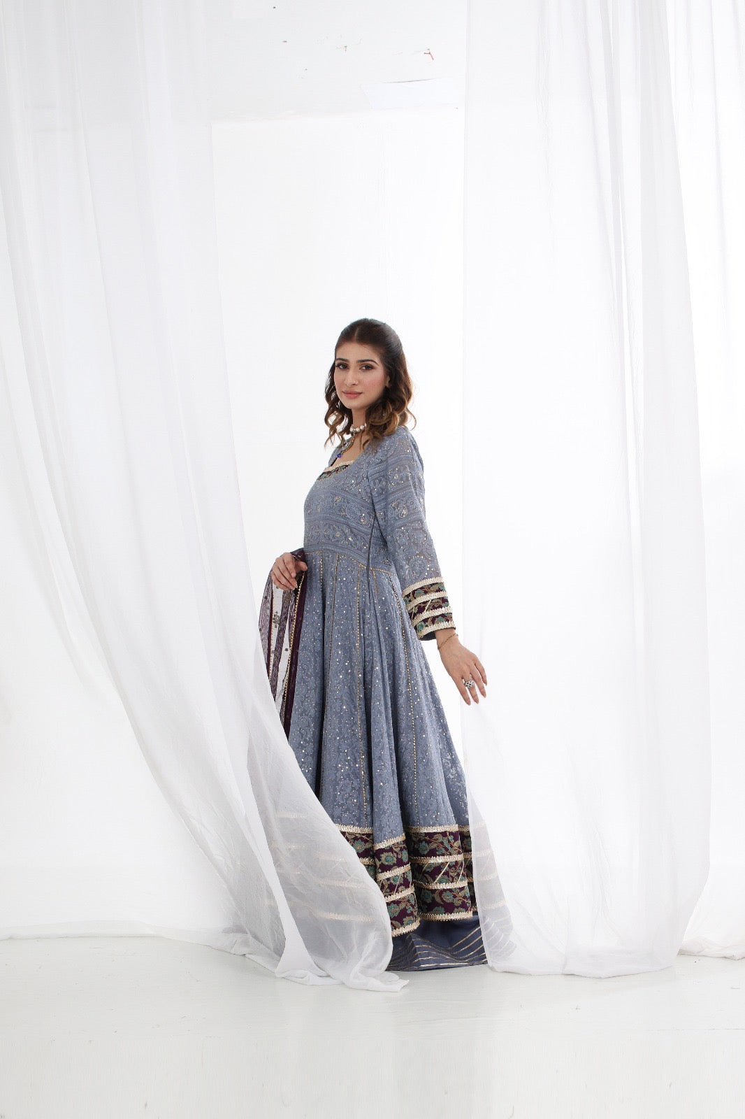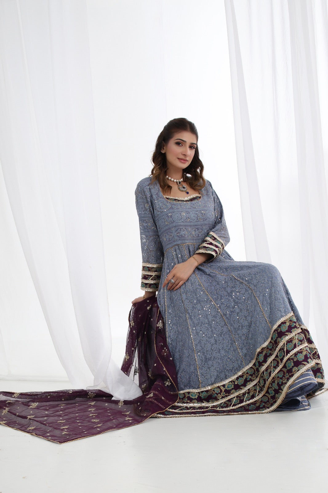 Lilac Chikankari peshwas with delicate embroidery, paired with a matching lilac sharara and a stunning jamawar dramatic border, accompanied by a chiffon embroidered duppata.