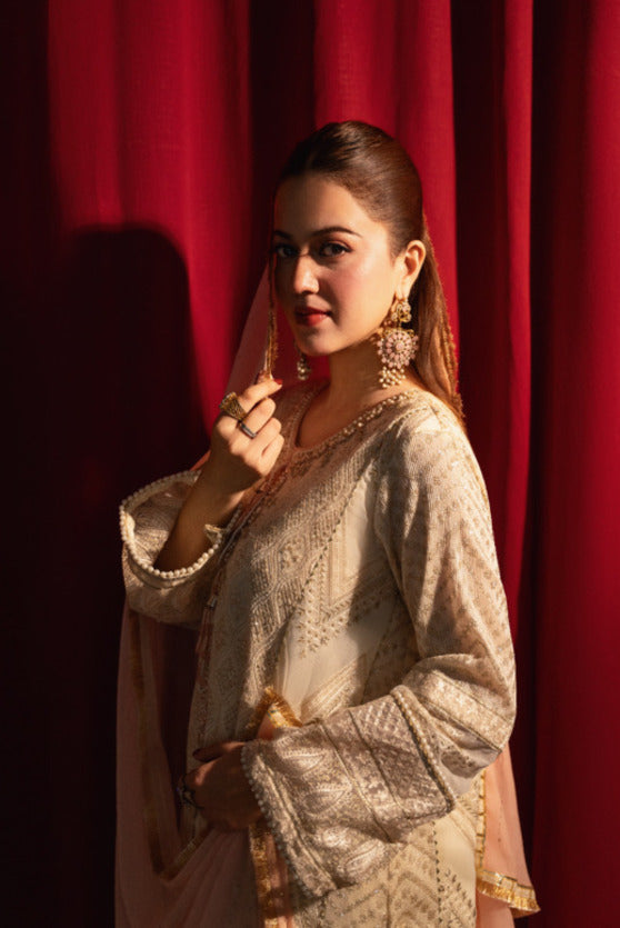 Exquisite straight long silhouette, Chikankari shirt paired with crushed pants and a soft, powder pink mukesh silk dupatta. The shirt features intricate hand-embroidered neckline with handmade beatuful pearl tassles, adding a touch of elegance to this beautiful ensemble."