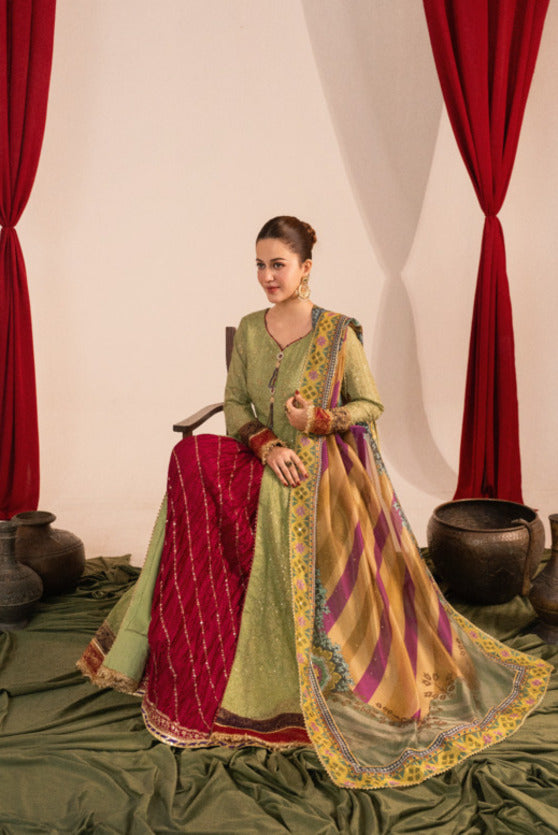 Elegant Chikankari kalidaar in fresh mint green, paired with vibrant purple crushed pants and a digital printed multicolored dupatta. The hand-embellished neckline adds a touch of luxury, while Jamawar borders elevate the look, in soothing shades of green and rich purple hues.