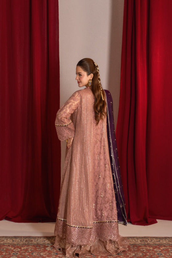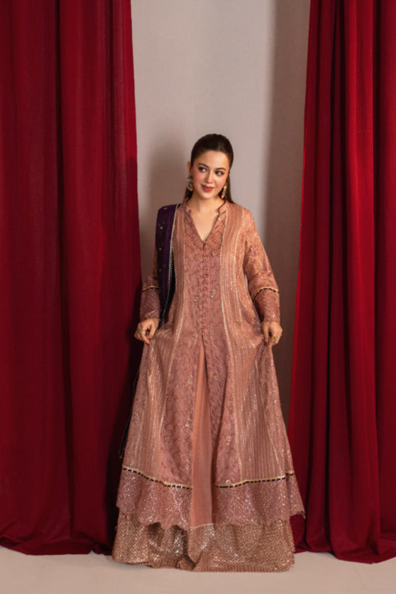 Rosy Mauve Kalidaar: Exquisite embroidered sequins kalidaar with intricately embroidered panels, adding depth and dimension. The lehenga boasts a dramatic sequence border, elevating its grandeur. Paired with an embroidered dupatta featuring a stunning purple accent, this ensemble exudes elegance and sophistication.